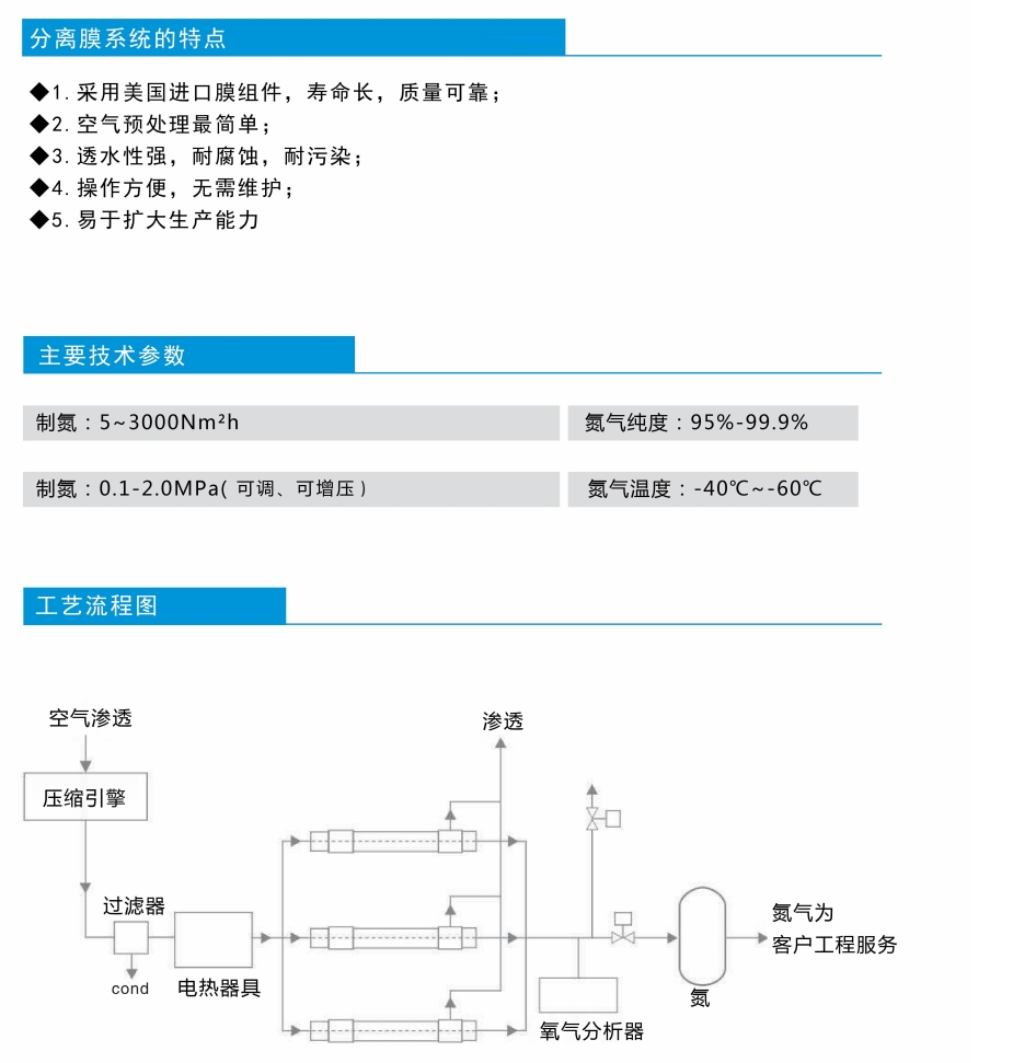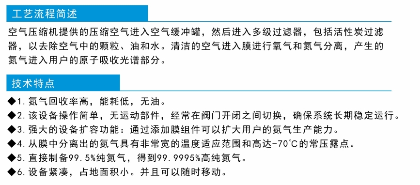 膜分离制氮设备是使用聚合物纤维材料作为分离单元,当空气在一定压力下通过膜纤维管时。由于空气成分在膜管中的溶解速度和扩散速度不同,氧气、氨气、二氧化碳和水蒸气等气体成分首先通过膜纤维毛细管渗透和扩散,而渗透速度较慢的氨气被保留和富集,成为产品氮气输出。